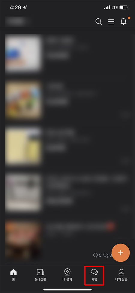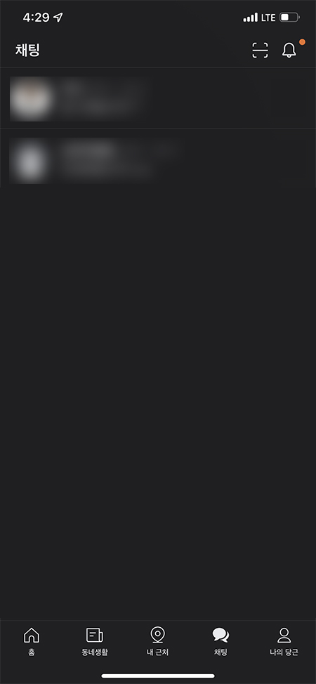 첫번째로는 대화를 삭제하는 방법부터 알아보려고 합니다. 거래를 마치거나 더 이상 이야기를 나눌 필요가 없을 때는 당근마켓 홈화면에서 아래에 있는 채팅 메뉴를 눌러서 들어가시면 됩니다. 그냥 목록에 두셔도 되지만 정리하는 것을 선호하시는 분들이라면 삭제해두는 것이 좋겠죠.