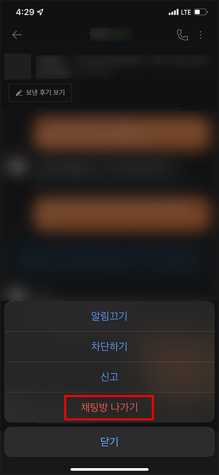 이렇게 아래쪽에서 알림끄기와 차단하기, 신고 등과 같은 메뉴가 나오면 제일 아래에서 채팅방 나가기를 누르면 됩니다. 종종 거래를 어떻게 했는지 확인해야할 때가 있어서 대화를 보기도 하는데요.