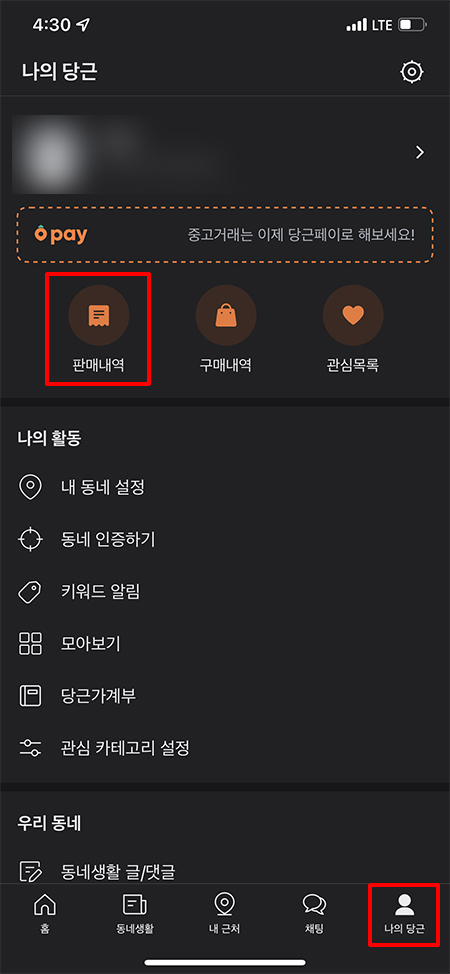 다음으로 내가 올렸던 당근마켓 게시물, 즉 올린 물건을 지우는 방법에 대해서 알아보겠습니다. 역시나 아래쪽에서 나의 당근이라는 메뉴로 들어간 후에 위쪽에 보이는 판매내역 아이콘을 눌러서 들어가주세요.