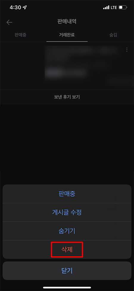 이곳을 보시면 판매중, 거래완료, 숨김 이렇게 세가지 상단바 메뉴가 있고 이곳들 중에서 보이는 물건에서 점 세개인 아이콘을 눌러주시면 됩니다.